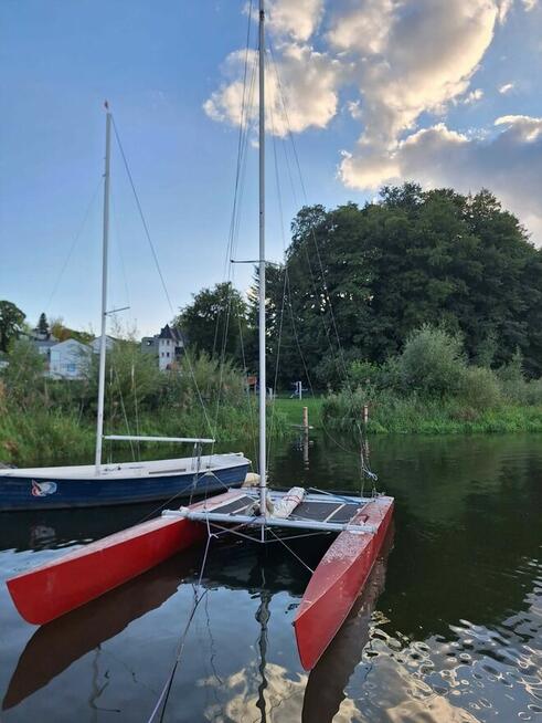 Katamaran Tornado, z aluminiowym wózkiem slipowym. Komplet żagli. Kadłuby w oryginalnym żelkocie, z żywicy epoxydowej ...